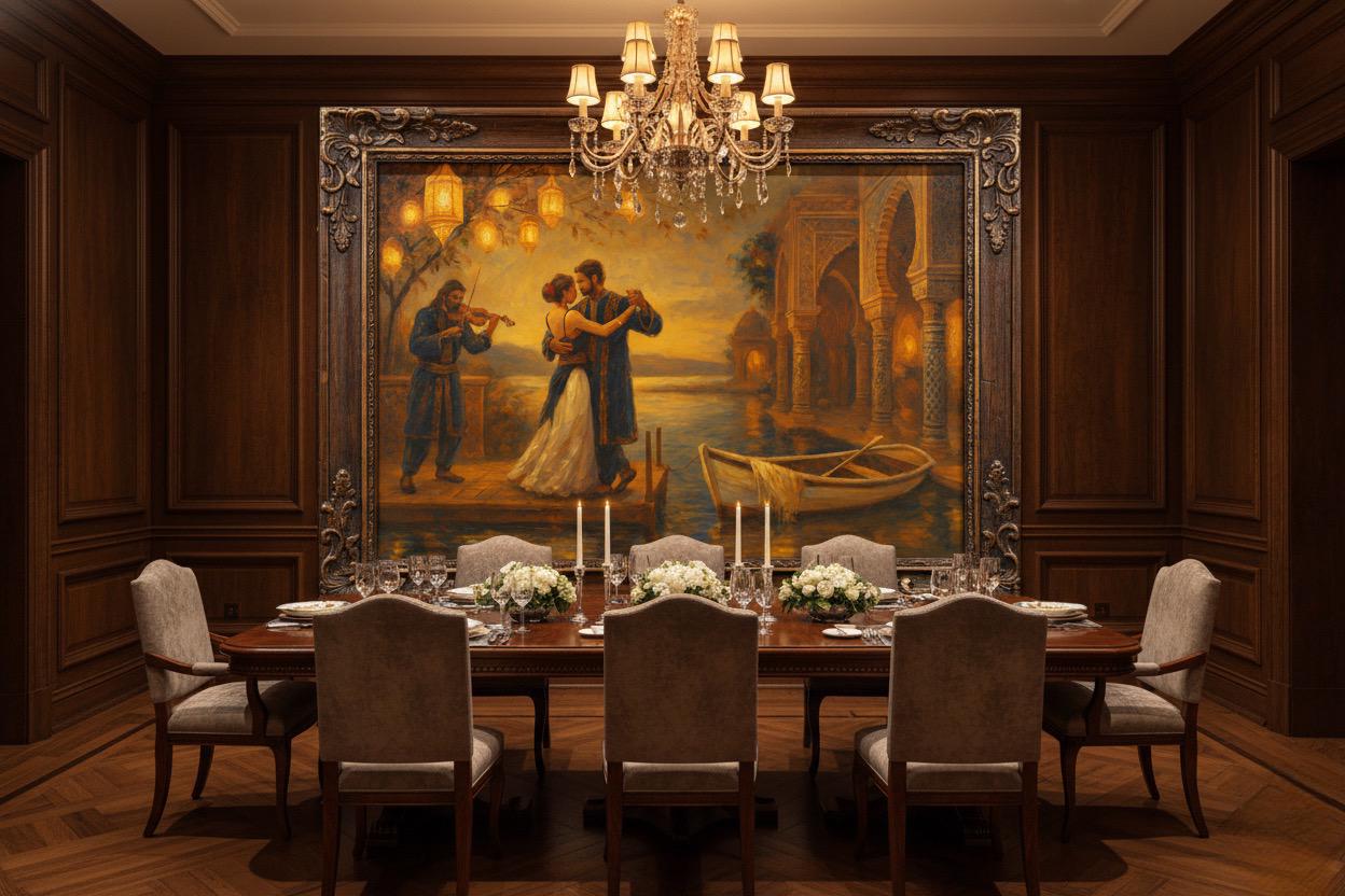 This artwork captures a couple dancing gracefully by a serene lake, illuminated by golden Moroccan lanterns under a tranquil twilight sky. In the background, the ornate arches and tilework reflect the elegance of Moroccan architecture, creating a scene filled with warmth, intimacy, and beauty.